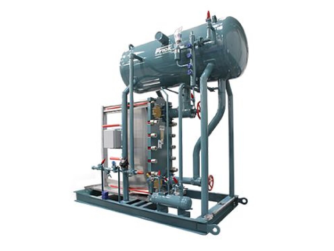 A plate and frame heat exchanger mounted on a structural base, piped to a liquid separator and wired with a NEMA 4 liquid level control panel.